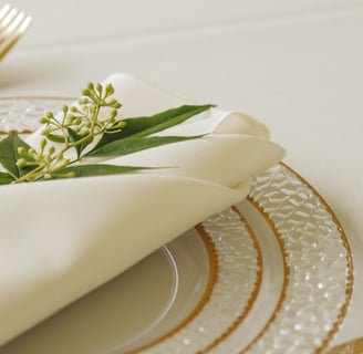 A toalha de mesa ou jogo americano é o ponto de partida. Para um visual clean e elegante, opte por peças em tons neutros ou estampas sutis. Tecidos naturais, como linho ou algodão, são perfeitos para trazer sofisticação.